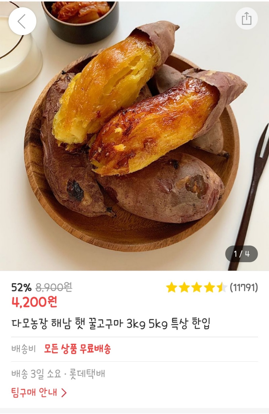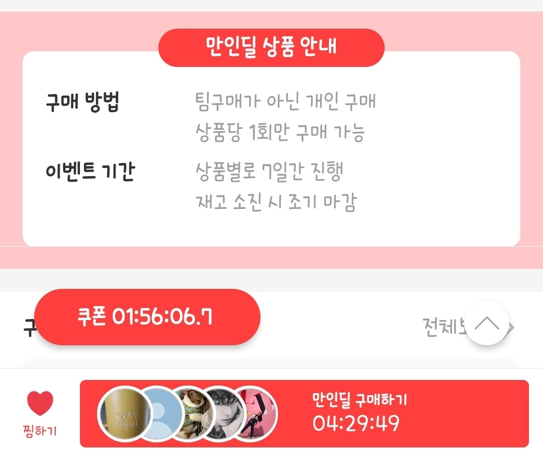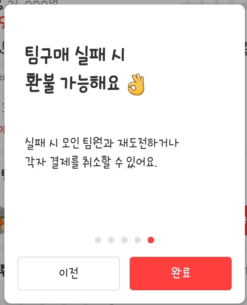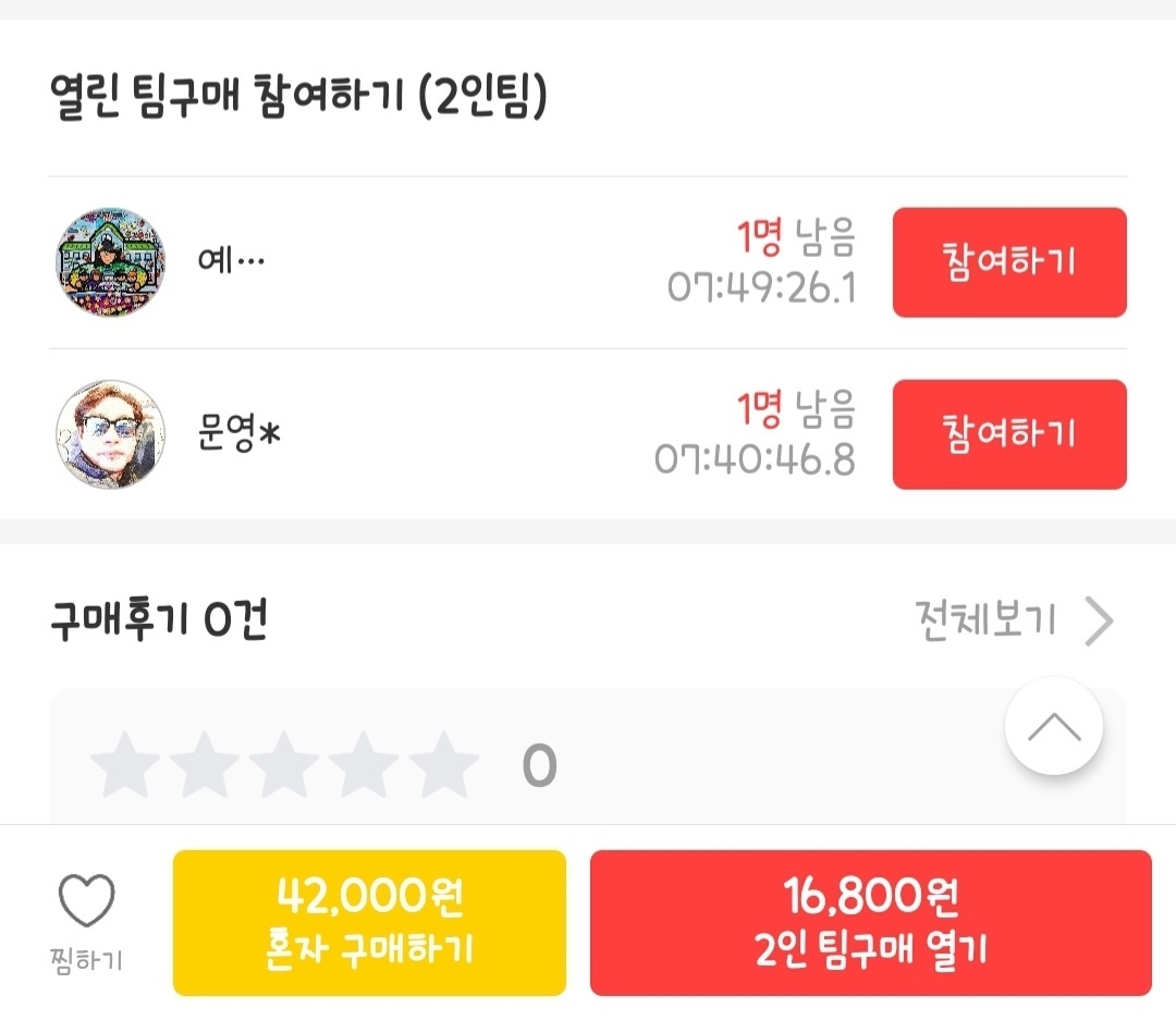 앱을 살펴보았을 때 두 가지 형식으로 구입이 가능합니다. 일반적인 이커머스에서도 흔히 볼수 있는 '혼자서 구매하기'와 공동구매 형식으로, 더 저렴하게 구입할 수 있는 '팀구매 열기' 입니다.