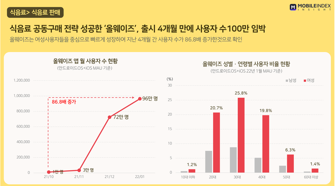 올웨이즈의 사용자 분포도를 중심으로 보았을 때 여성들이 압도적으로 많고, 2040세대에서 많은 이용을 하고 있었습니다. 아무래도 남성들보다는 여성들이 가격을 비교하며 물건들을 구입하는 경향이 있기 때문인 것을 생각됩니다. 또 처음 바이럴을 일으킨게 '양파'라는 식품이기 때문에 장을 보고 요리를 하는 여성들이 주로 유입된 것으로 보입니다. 비슷하게, 자취를 많이 하는 2030 남성들 또한 다른 연령대보다 많은 시용을 하고 있습니다.