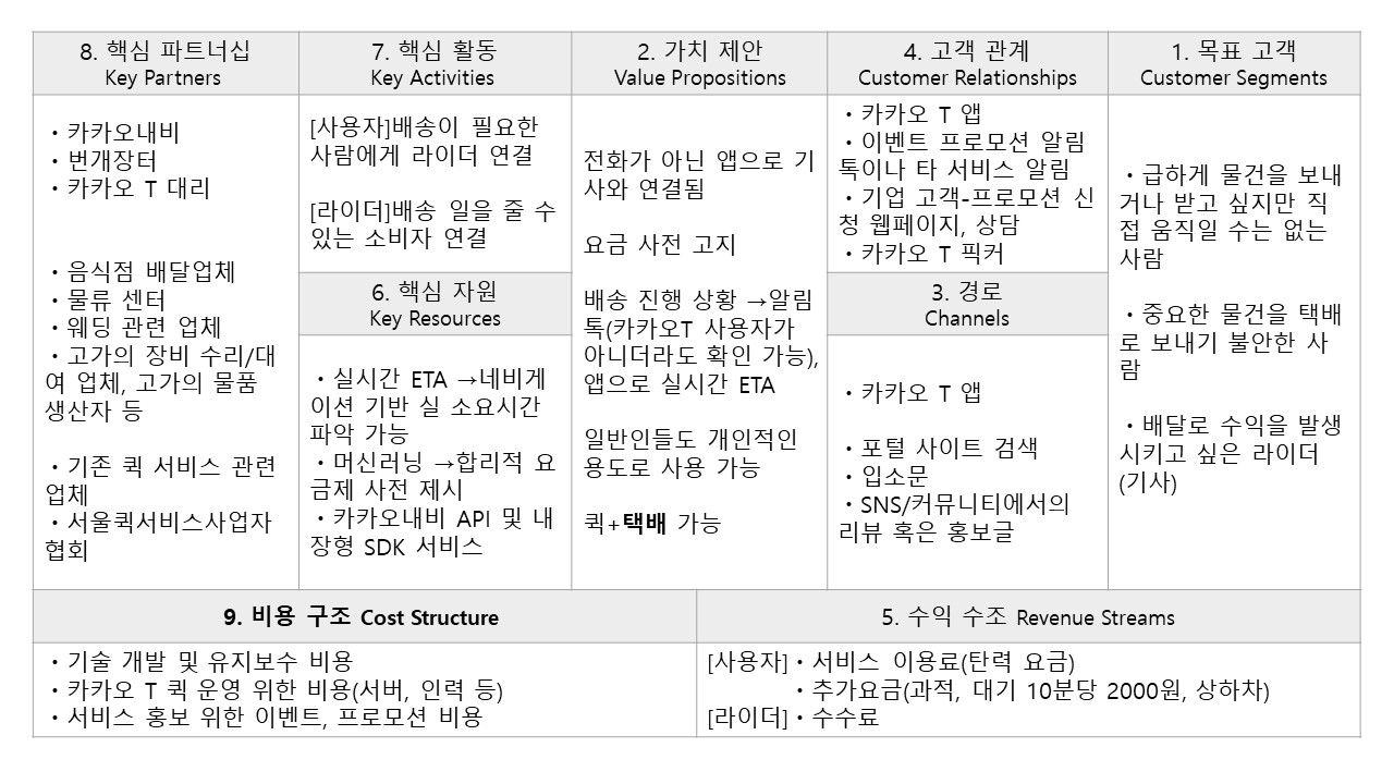 이런 카카오 T 퀵은 어떤 구조를 갖고 있는지 비즈니스 모델을 Business Model Canvas를 바탕으로 분석해보려고 해요.