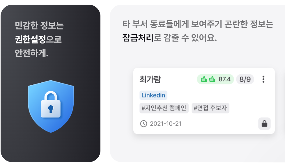 권한 설정 기능을 활용해서 타 부서 동료들과 협업할 떄 원하는 범위의 정보면 공개하여 효율적인 소통이 가능하도록 하고 있습니다.