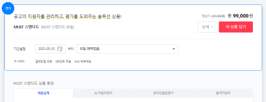 상세 내용을 보면 채용 홈페이지를 제작할 수 있도록 서비스를 제공하고, 접수 시스템 구축함으로써 지원자/후보자 관리 및 소통, 면접 일정 조율, 평가 협업, 발표 등을 인사 담당자가 진행해야 하는 채용 업무에서 반복적인 지원관리의 효율화를 도모하고 있습니다.