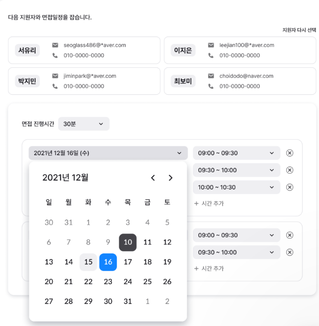 .저도 기업에 지원해서 면접 일정을 기다릴 때, 지원자 입장에서 언제 일정이 나오는지 다른 일정과 겹치지는 않은지 많이 초조했었거든요. 그리고 직접 담당자와 희망 날짜를 소통할 때도 제가 원하는 시간에 인터뷰가 가능한지 알기 위해서 한참 메일을 기다려서 불편했었거든요. 해당 기능을 사용한다면 이런 불편함 없이 채용담당자와 지원자 모두에게 긍정적인 경험을 선사해줄 수 있을 거라 생각됩니다.