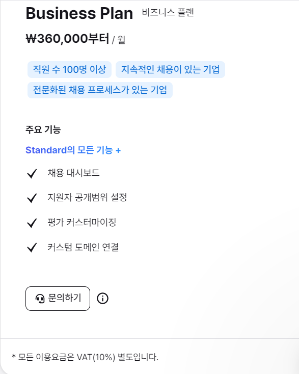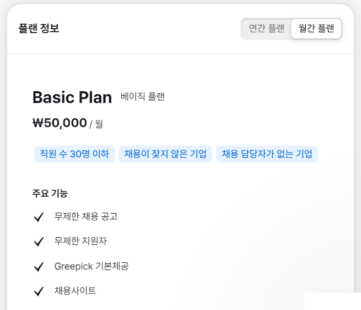 인크루트는 가격을 확인할 수 없었는데 사람인에서 제공하는 솔루션의 가격과 비교했을 때 그리팅은 상대적으로 저렴한 가격 정책을 시행하고 있습니다. 그리고 직원 수에 따라 강제로 추가 과금하고 있지 않습니다. 기업 규모에 따른 권장 플랜은 있지만 어떤 플랜을 사용해도 상관은 없다고 합니다.