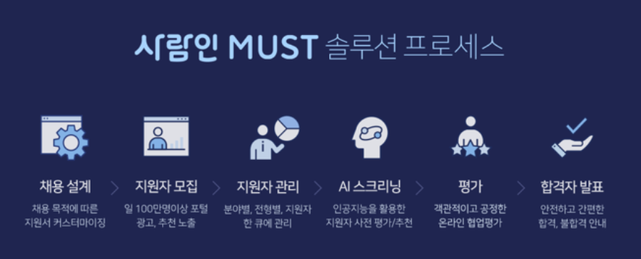 사람인에서도 '반복적인 업무로 시간이 많이 소요된다'는 문제점에 포커스하여 지원자가 서류 접수를 한 시점부터 합격자 발표까지의 과정을 효율화하고 있습니다. 다만 다양한 플랫폼에 적용되는 솔루션이 아니라 '사람이' 채용 사이트에 한정돼서 ATS 솔루션이 적용됩니다. 쉽게 말하면 사람인에서 채용 공고를 올리고 지원자를 받고, 프로세스를 관리하는 방식을 효율화한 것이죠.