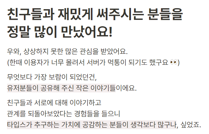 개인적으로 이렇게 MBTI 관련해서 단발성 이벤트 페이지가 아닌 앱 서비스로 나왔다는 점이 인상깊었어요. 기존의 다른 서비스들의 한계를 극복하고 어떻게 사용자들이 서비스를 지속적으로 이용하게 만들 것인지, 어떻게 서비스를 유지하고 디벨롭할 것인지 기대가 많이 됩니다. 특히 계속해서 서비스를 운영하려면 비즈니스 모델을 구축해야 할텐데 광고를 최소화(현재는 광고없음)한다는 정책을 기반으로 어떤 수익구조를 만들어갈지 참 궁금합니다. 사실 이번에 비즈니스 모델에 대한 고민도 나름대로 해봤고 같이 풀어보고 싶었는데 시간관계상(ㅋㅋ) 랜딩페이지 부분만 살펴보았어요! 아무튼 지금의 핫한 바이럴을 계속해서 유지해갈 수 있는지 관심있게 지켜볼 예정입니다. 여러분들도 MBTI에 관심이 있다면 요즘 트렌드에 발맞추어 타입스 한 번 어떠세요?