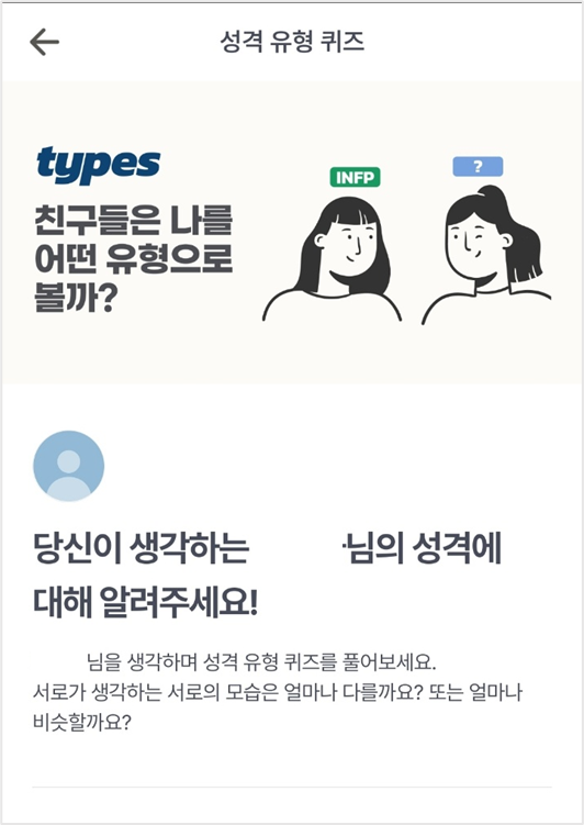 - 서브카피: 000님을 생각하며 성격 유형 퀴즈를 풀어보세요. 서로가 생각하는 서로의 모습은 얼마나 다를까요? 또는 얼마나 비슷할까요?