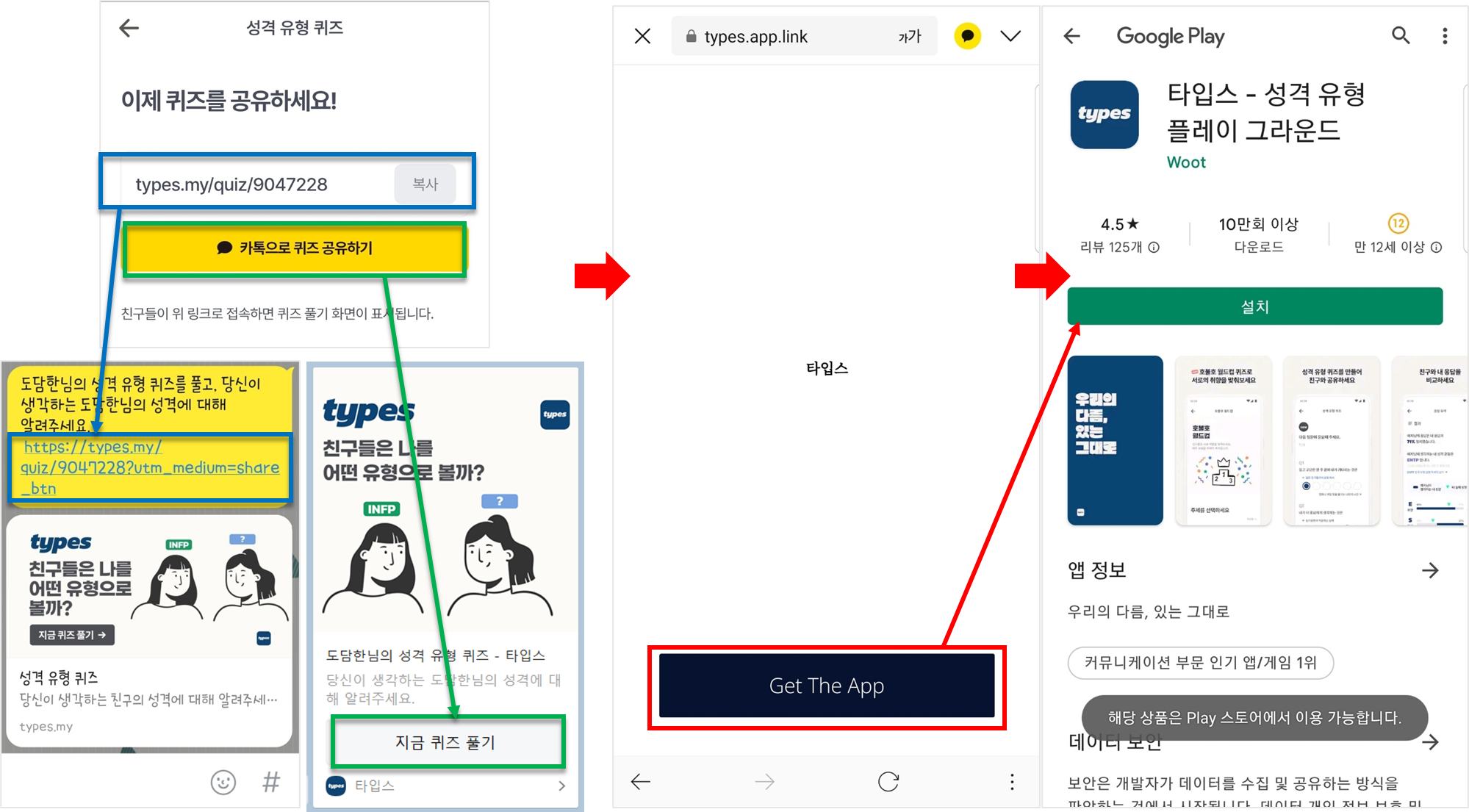| ASIS | ①공유 링크/지금 퀴즈 풀기 → ②CTA "Get The App" → ③Play스토어 설치 → ④"카카오 계정으로 시작하기" → ⑤"동의하고 계속하기" → ⑥"푸시 알림 켜기"→ ⑦HOME → ⑧친구의 퀴즈 다시 찾아서 들어가기 → ⑨ 퀴즈 1-4페이지 → ⑩성격 유형 케미 조사 → ⑪응답이 완료되었습니다! |
