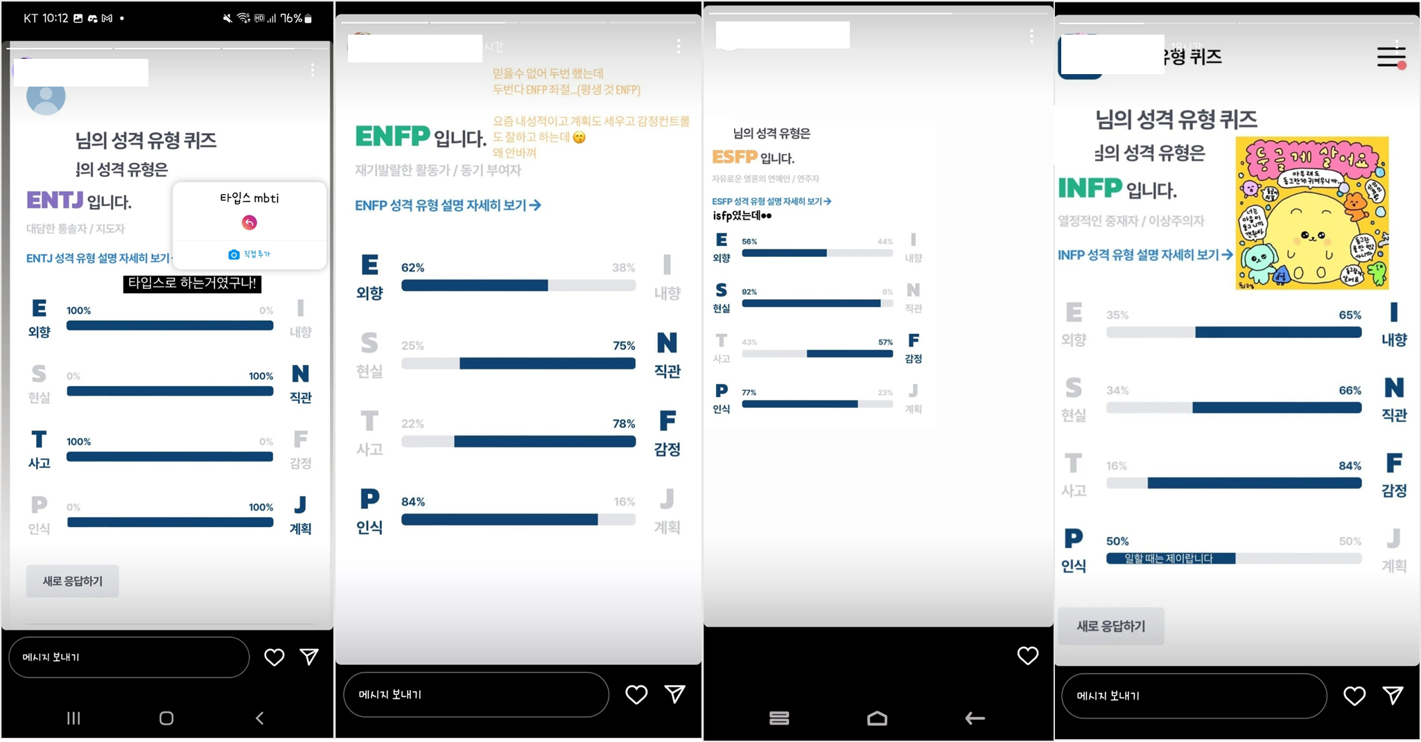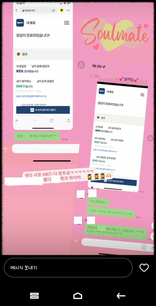 좌측의 블로그를 살펴보면 타입스를 통해서는 나의 MBTI 뿐만 아니라, 다른 사람들이 생각하는 나의 모습을 짐작해볼 수 있습니다. 그 점을 많은 사용자들이 매력적으로 생각하고 있는 것 같았는데요. 우측의 인스타그램 스토리를 보아도 친구들이 서로를 어떻게 생각하고 이는지 타입스에서 제공하는 퀴즈를 풀어보며 즐기고 있는 것을 알 수 있었습니다.