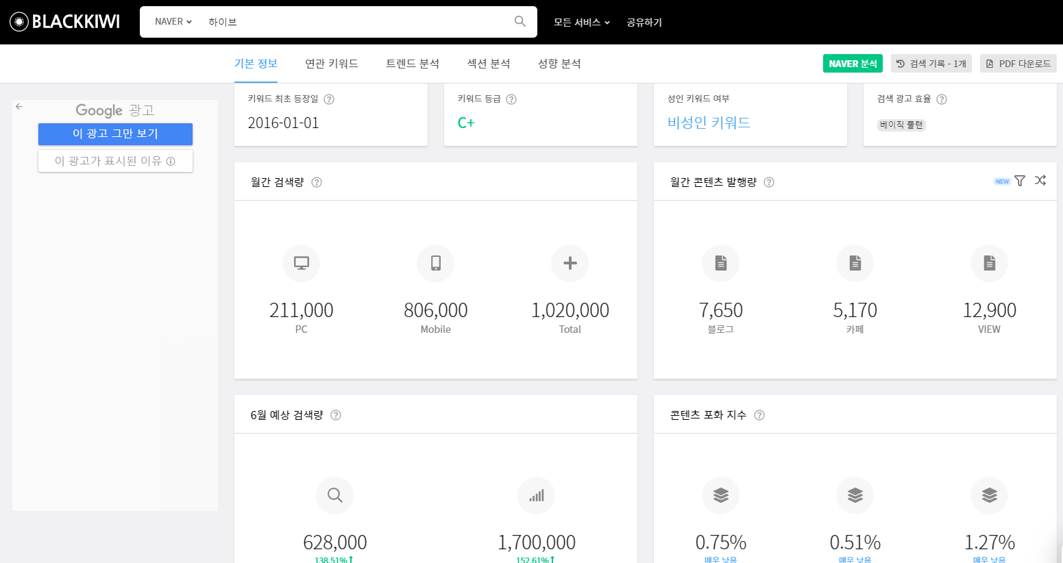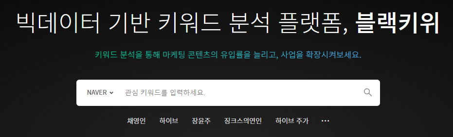 블랙키위는 키워드 분석을 바탕으로 하는 플랫폼이기 때문에 '분석' 기능이 가장 핵심이 된다고 볼 수 있습니다.