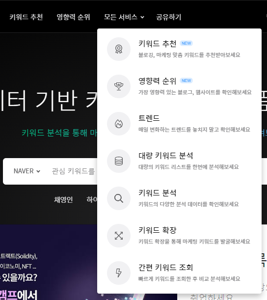 키워드 분석 외에도 다양한 분석 서비스를 제공하고 있습니다. 하지만 일단 홈에 제공하고 있는 '키워드 분석'이 가장 메인이 되는 서비스이기 때문에 홈 중간에 크게 제공하고 있다고 생각돼요. 그래서 '키워드 분석'을 핵심 기능이라고 정의하고자 합니다.