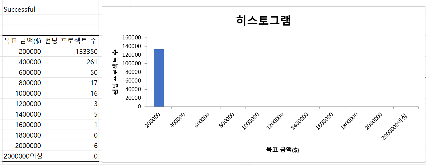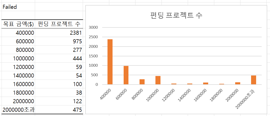 우선, 가설이 성공과 실패여부만 고려하였기 때문에 앞서 받은 자료들 중 펀딩 성공과 실패 케이스만 액셀에서 정제해보았습니다. successful과 failed 외에도 live, suspended, canceled의 케이스도 있더라구요. 그리고 잘못 들어간 데이터들도 모두 제외한 뒤에 성공과 실패 케이스의 데이터를 분리하였습니다. 둘의 그래프를 별도로 만들어서 비교해볼 예정이거든요.