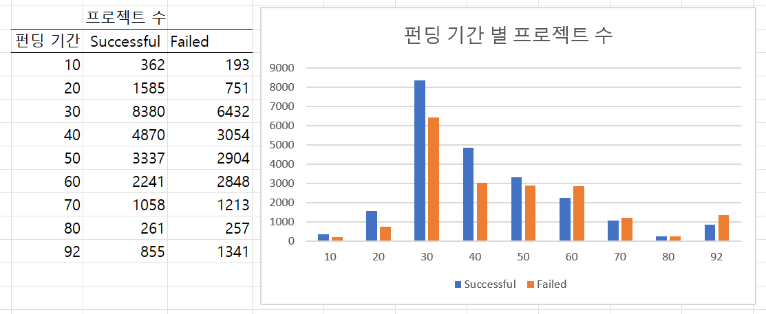 아, 참고로 실패한 펀딩 수가 성공한 케이스보다 약 1.5배 모수가 많았습니다. 자세한 데이터는 위와 같아요.