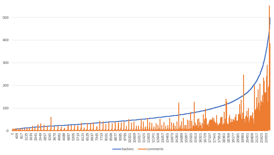 아무튼 그래프가 우상향을 그리고 있음을 확인할 수 있었습니다. 이러한 그래프를 통해 comment가 많을 수록 backers(서포터)가 증가한다는 상관 관계를 갖고 있음을 알 수 있었습니다.