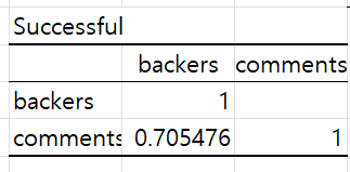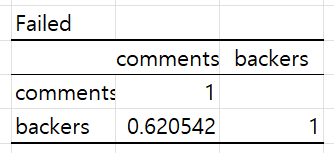 그래서 상관분석을 해보았습니다. 상관계수는 1로, 1에 가까울수록 두 데이터 간의 관계가 있고, 0에 가까울수록 관계가 없다고 합니다. 펀딩이 성공한 케이스의 경우에는 0.7으로 상관관계가 어느 정도 있어 보입니다. 실패한 펀딩의 경우에는 이 상관지수가 낮아지기는 했지만 절반보다는 많은 수치가 나왔네요.