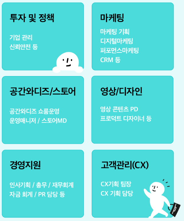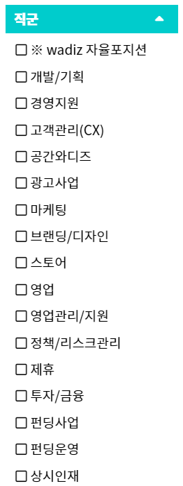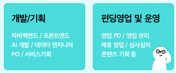 이렇듯 빠르게 성장하는 기업이니만큼 와디즈에서는 각 분야의 전문가들을 바탕으로 촘촘한 조직을 구성하고 있는 것으로 보입니다. 구체적인 조직도는 공개되지 않아 진행중인 채용 공고 등에 노출된 직무들을 기반으로 추측해 볼 수 있었습니다. 펀딩을 원활하게 진행하고, 또 서비스를 운영하기 위해 조직을 세부적으로 나누고 있는 것으로 보이고, 이에 따라 인력 충원도 적극적으로 하는 것으로 보입니다.