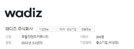 채용 공고를 보면, 제품 기반의 펀딩 프로젝트를 주로 관장하는 '와디즈'와 투자 형태의 펀딩을 관장하는 '와디즈 파이낸스'로 구분되어 있고 프로덕트 단의 업무를 주로 하는 개발/기획 외에도 경영지원, 고객 관리, 마케팅 등의 세부 직무들이 있는 것으로 보입니다. 또, 잡코리아에 따르면 300여 명 정도로 구성되어 있습니다.