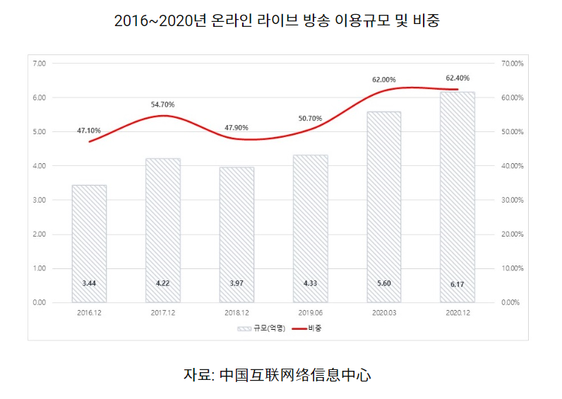 중국의 2020년의 라이브커머스 전자상거래업자 등록 수는 약 3억8800만 명이며, 라이브커머스를 통해 상품을 구입한 사람은 전체 전자상거래 이용자의 66.2%를 차지했고 이 중 17.8%가 전체 인터넷 쇼핑 이용액의 30% 이상을 소비한 것으로 나타났습니다.