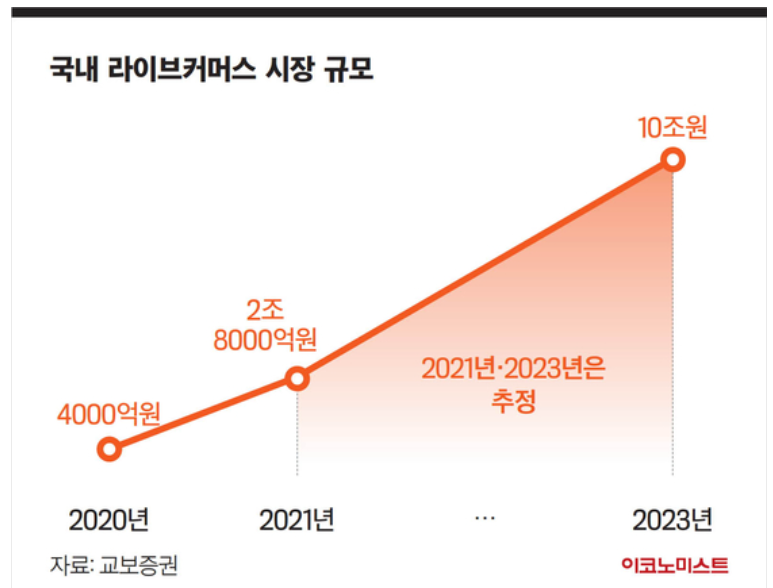 교보증권 리서치센터 자료에 따르면 국내 라이브커머스 시장 규모는 2020년 4000억 원에서 2021년 2조8000억 원으로 7배 성장했고 올해는 6조 원 수준, 2023년에는 10조 원까지 성장할 것으로 전망했습니다.